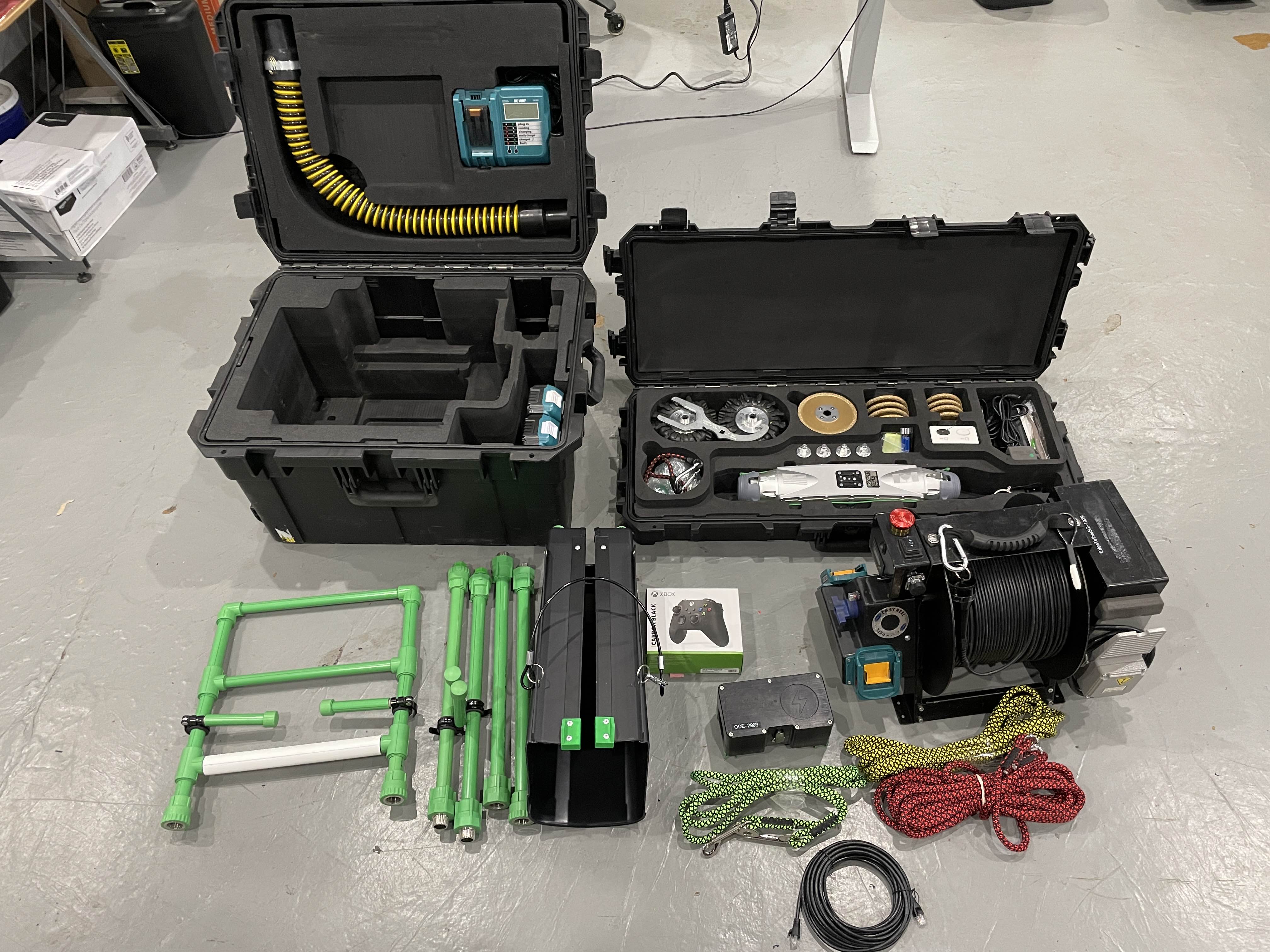 The complete Pipe Dream system with standard 2k 360 degree fisheye camera heads. This package includes all accessories needed to deploy into sewer and storm lines, with additional materials to aid in the maintenance of your system. It includes the main electronic components which are the reel, robot, and odometry box, as well as wheels, ropes, garage, and other smaller parts.