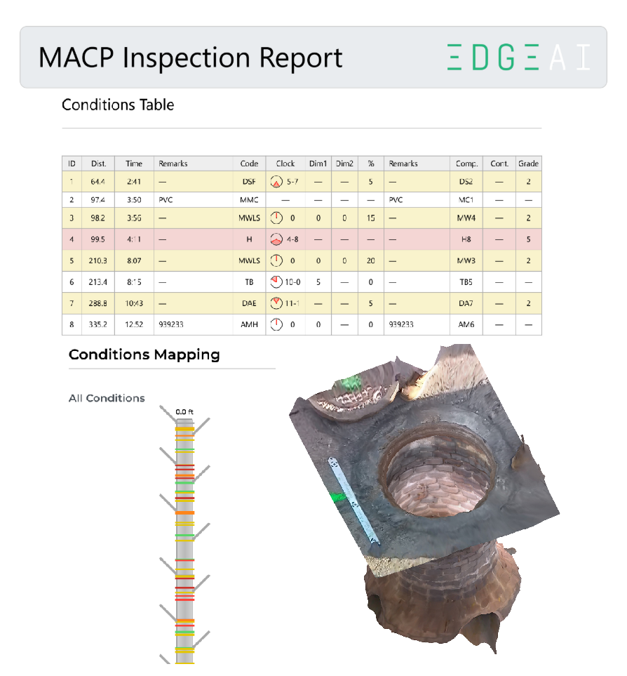 A complete MACP coding subscription for 2000 manholes. This is a service provided by Edge AI through our online portal. Approve inspections remotely to have the Edge AI team code them within 5-10 business days and deliver MACP certified reports for level 1 or level 2.